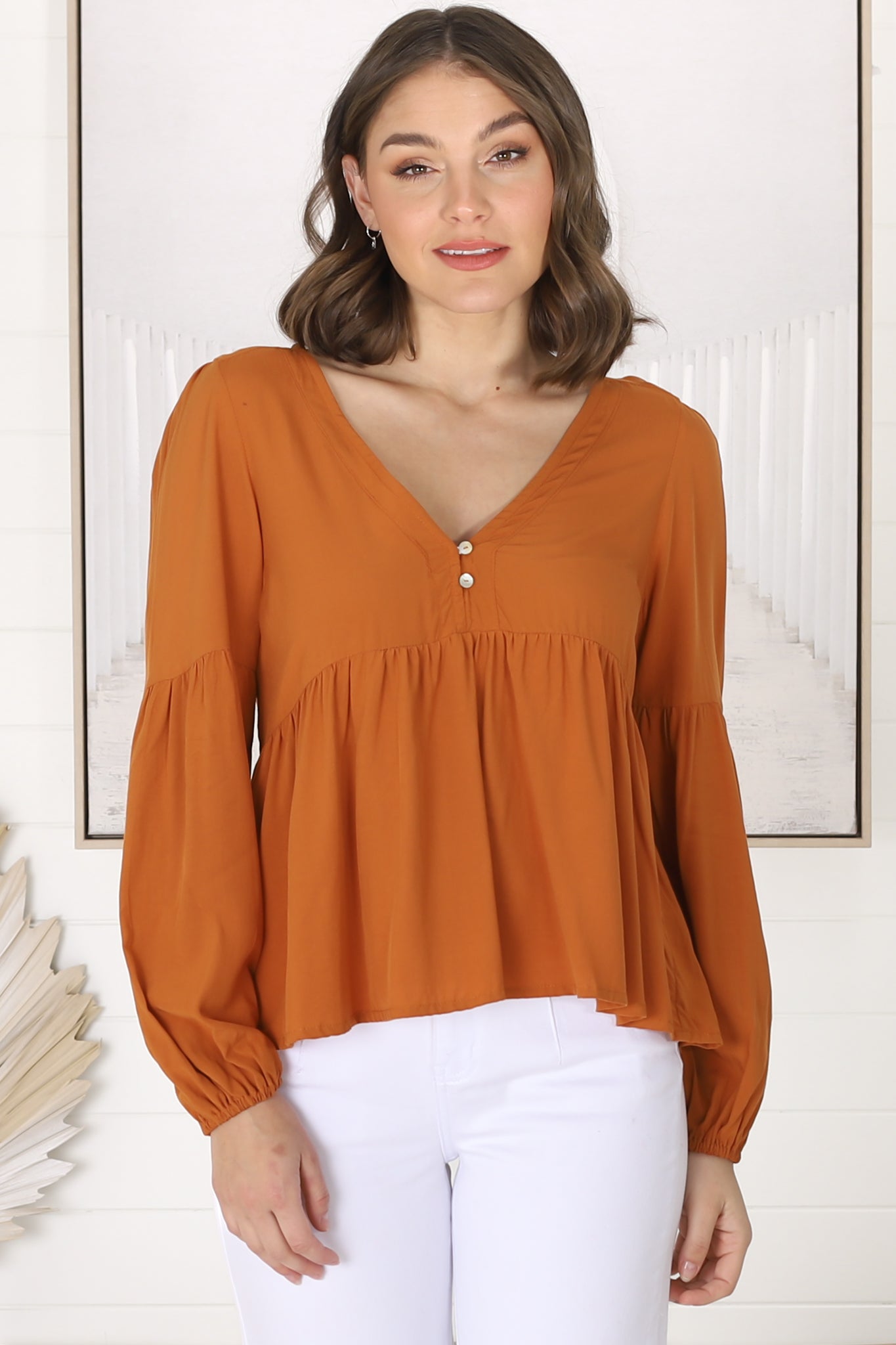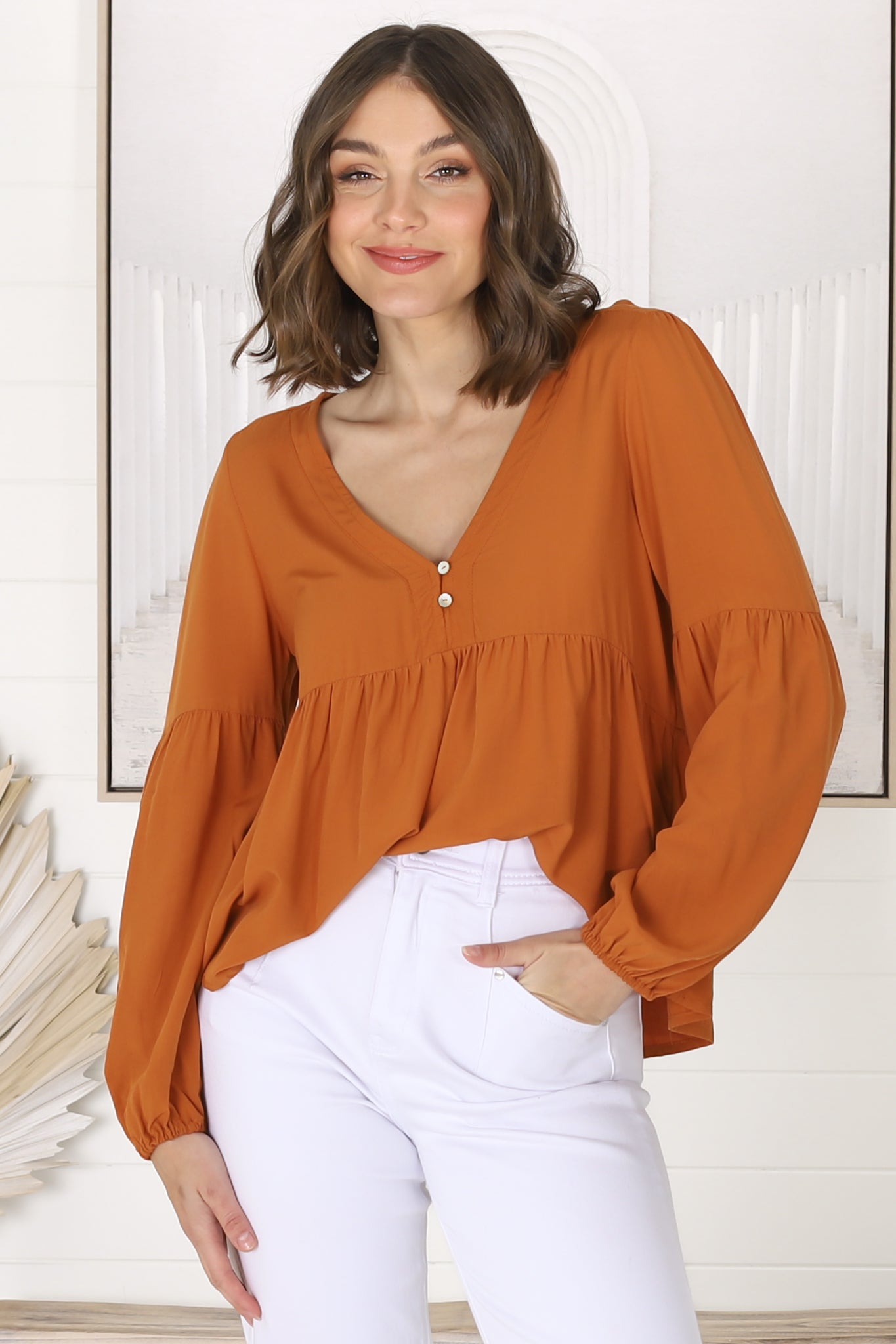 Grace Top - V-Neck Button Decal Long Sleeve Smock Top in Rust