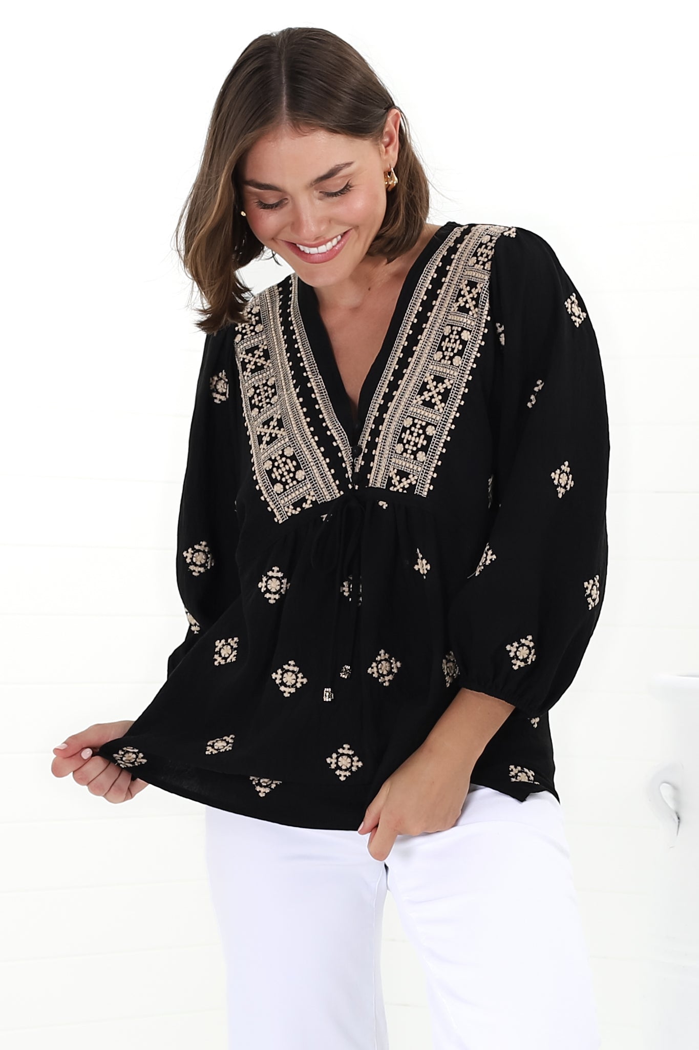 Boho patterns and autumn vibes best describe the stunning Joelle Top in Yara Print Black. We'll be wearing this pretty boho number all season long!