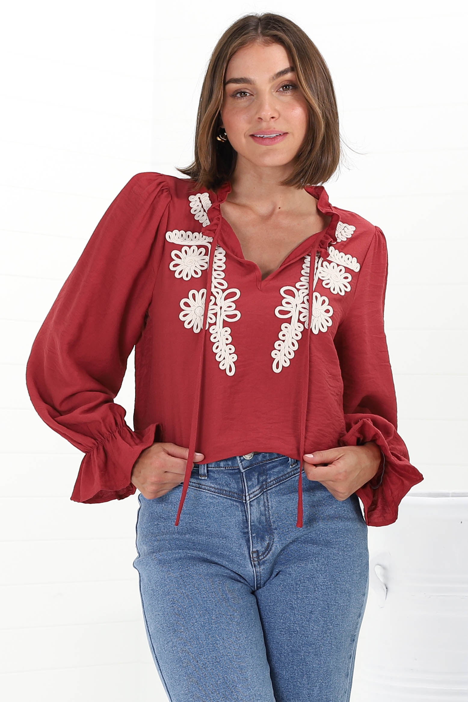 This red Lucian Blouse exudes bohemian elegance with its delicate cream embroidery and effortless silhouette. Perfect for adding a touch of romantic charm to your wardrobe, it transitions seamlessly from casual days to special occasions.