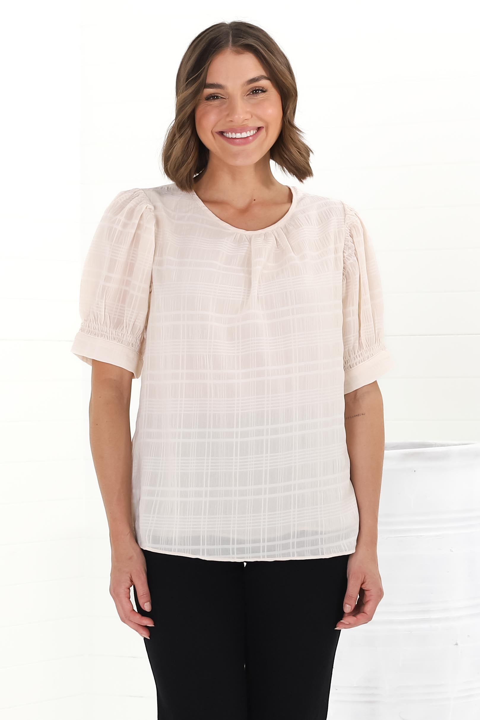 Murie Blouse - Crew Neck Checkered Texture Top with Short Sleeves in Cream
